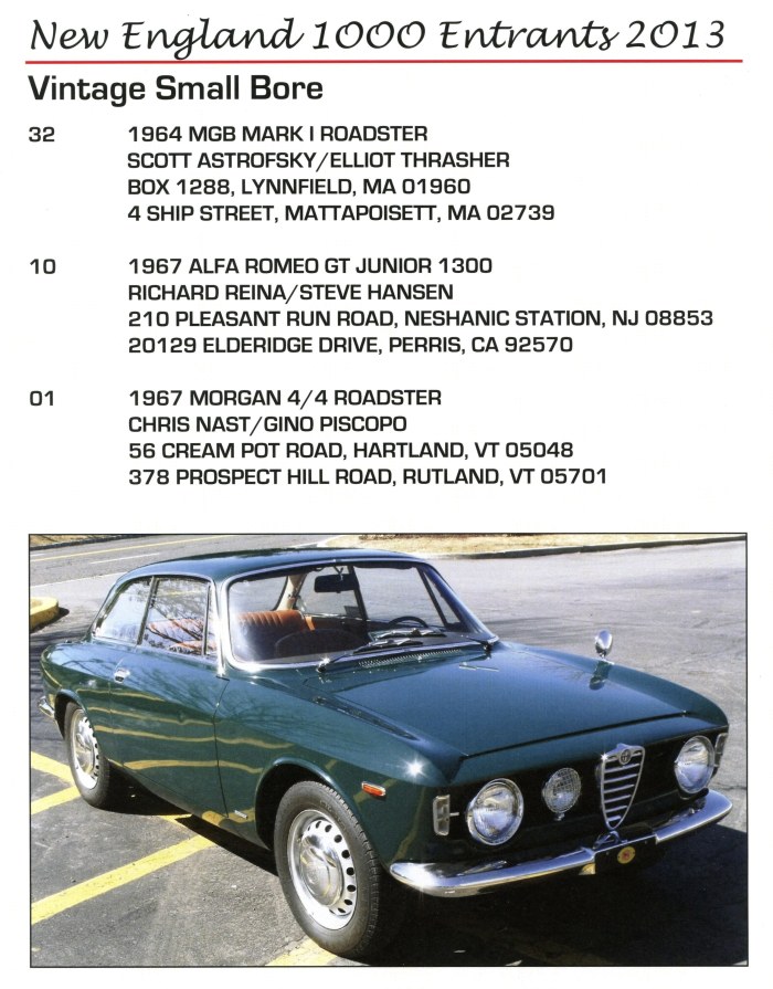 Happy New Year! It’s winter, with not much going on in the garage or out in the collector car world, so it’s a good time to catch up with some old business. Below is my summary of our participation in the 2013 New England 1000 rally. Previous reports for the 1998, 1999, 2000, 2001, 2005, and 2007 rallies can be found at the highlighted links.