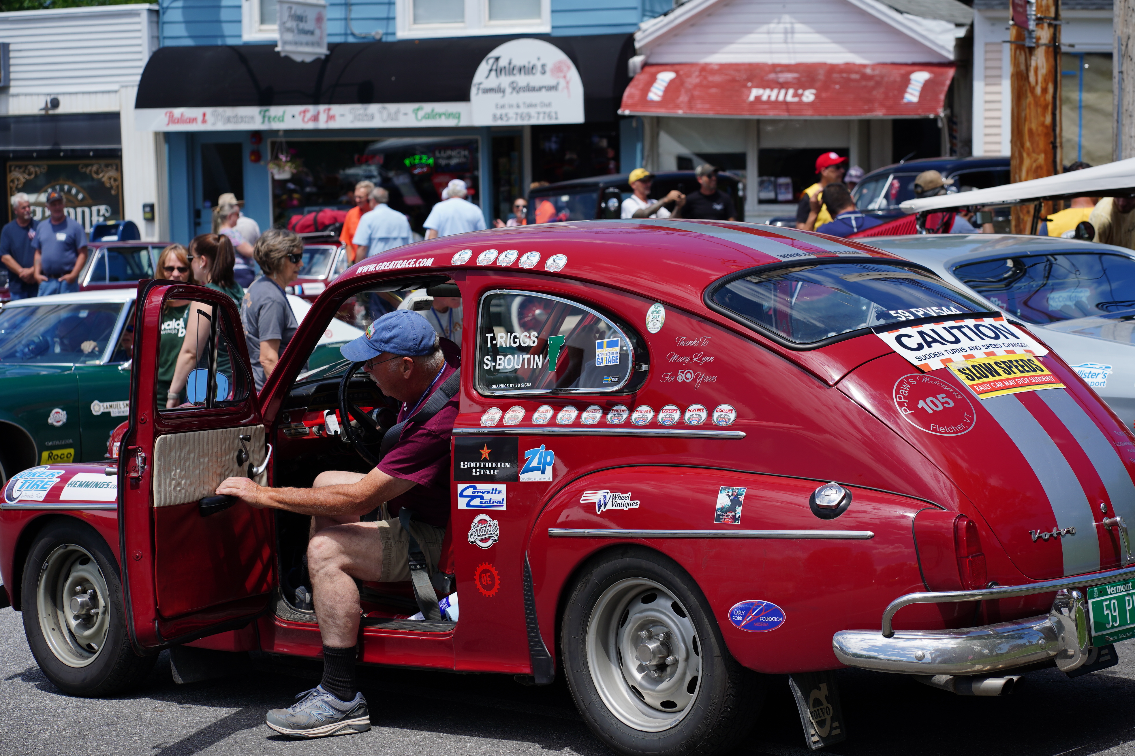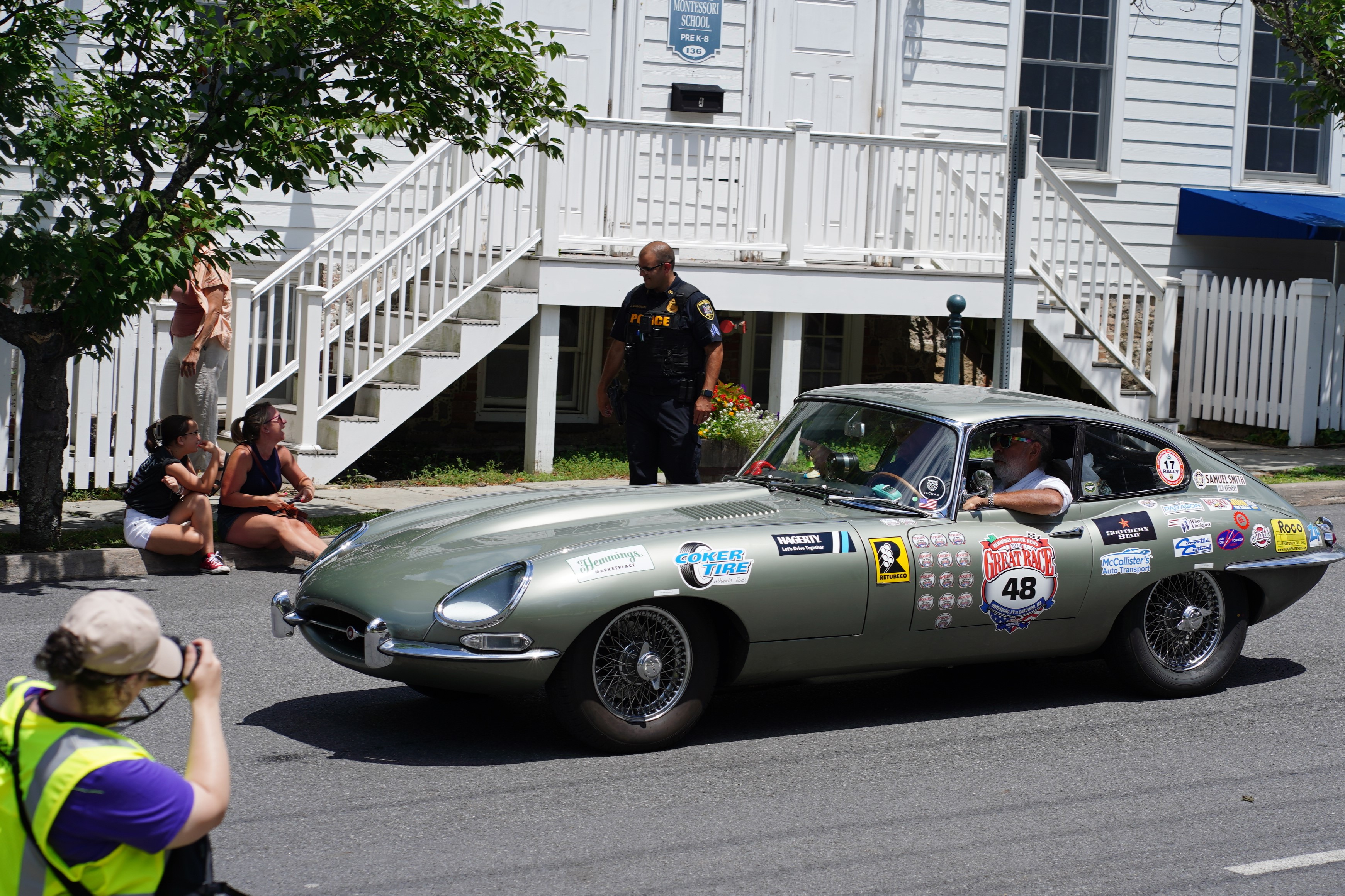 When I learned a while back that this year’s Great Race fleet (136 cars strong) would be making a lunch stop on Thursday, June 27, in Montgomery, NY, and that the public was invited to view the arriving spectacle, I contacted a friend who lives not too far from there, and we joined the throng of several hundred other spectators. Race cars began arriving around 11:30 a.m. and continued to arrive until close to 2 p.m. It was all extremely organized, with dozens of Great Race team workers controlling everything from check-in to traffic flow to parking. Lunch for the vehicle teams was provided under a big tent, and there’s no time to hang out when you’re trying to cover 2,300 miles: participants were given exactly 30 minutes to eat (and presumably use a restroom) before they were expected to be back on the road.