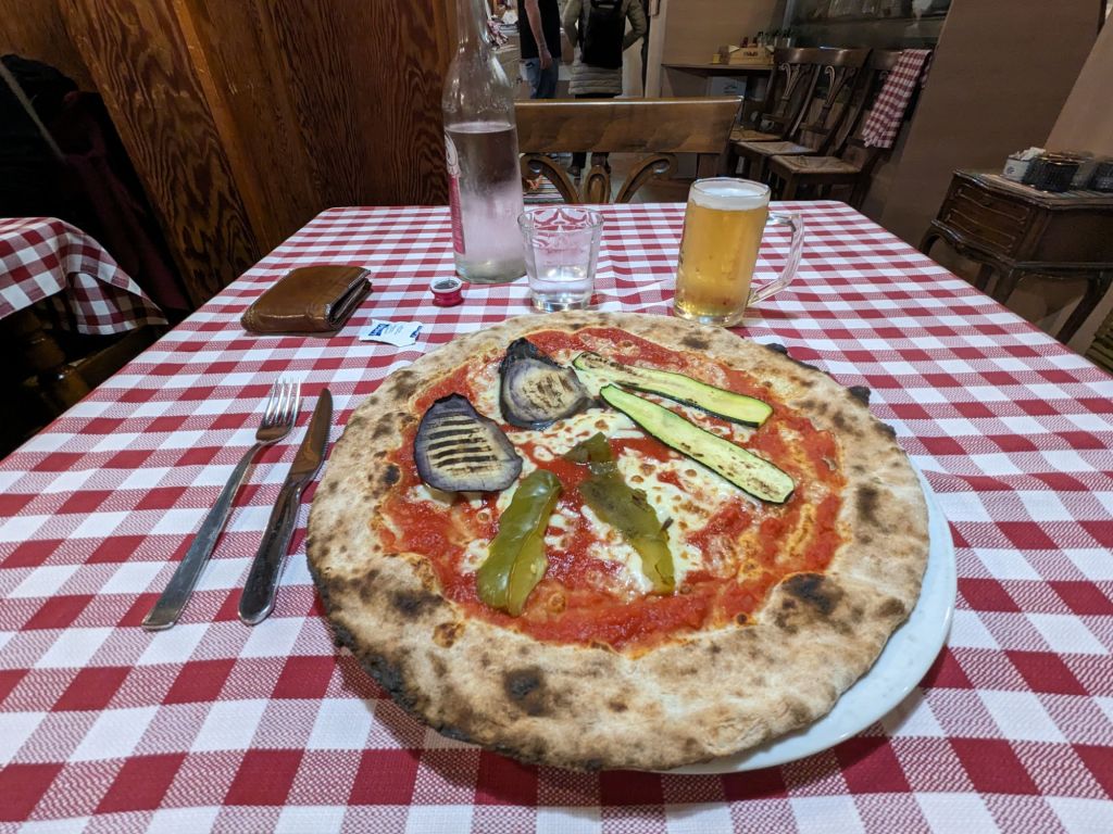Have I mentioned the food yet? I’ve long espoused that there are no bad meals in Italy. Last night I had pizza for dinner for the first time, and of course it was great. When you order pizza, you get a small personal pie, thin crust, rather easy for one person to devour. A beer helped wash it down.