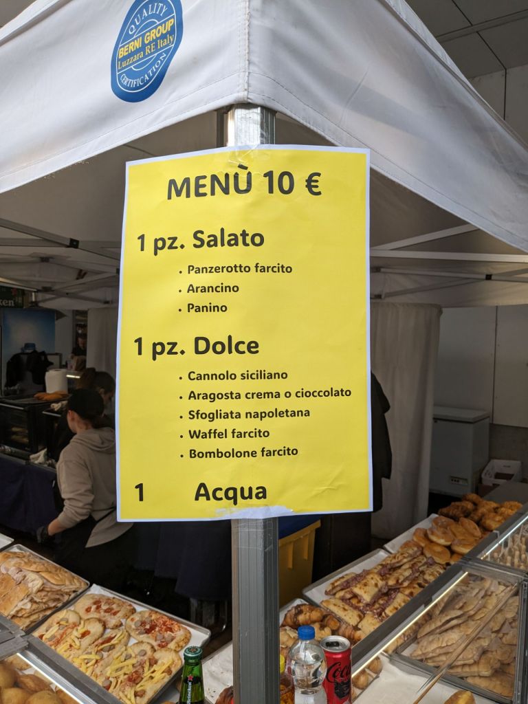 The show was crowded again today, with very long lines at all the lunch counters. I strolled away from the crowds, and came across this vendor selling a fixed price lunch for €10. I had my choice of a sandwich or rice ball, a dessert, and a bottle of water. It all was great of course!