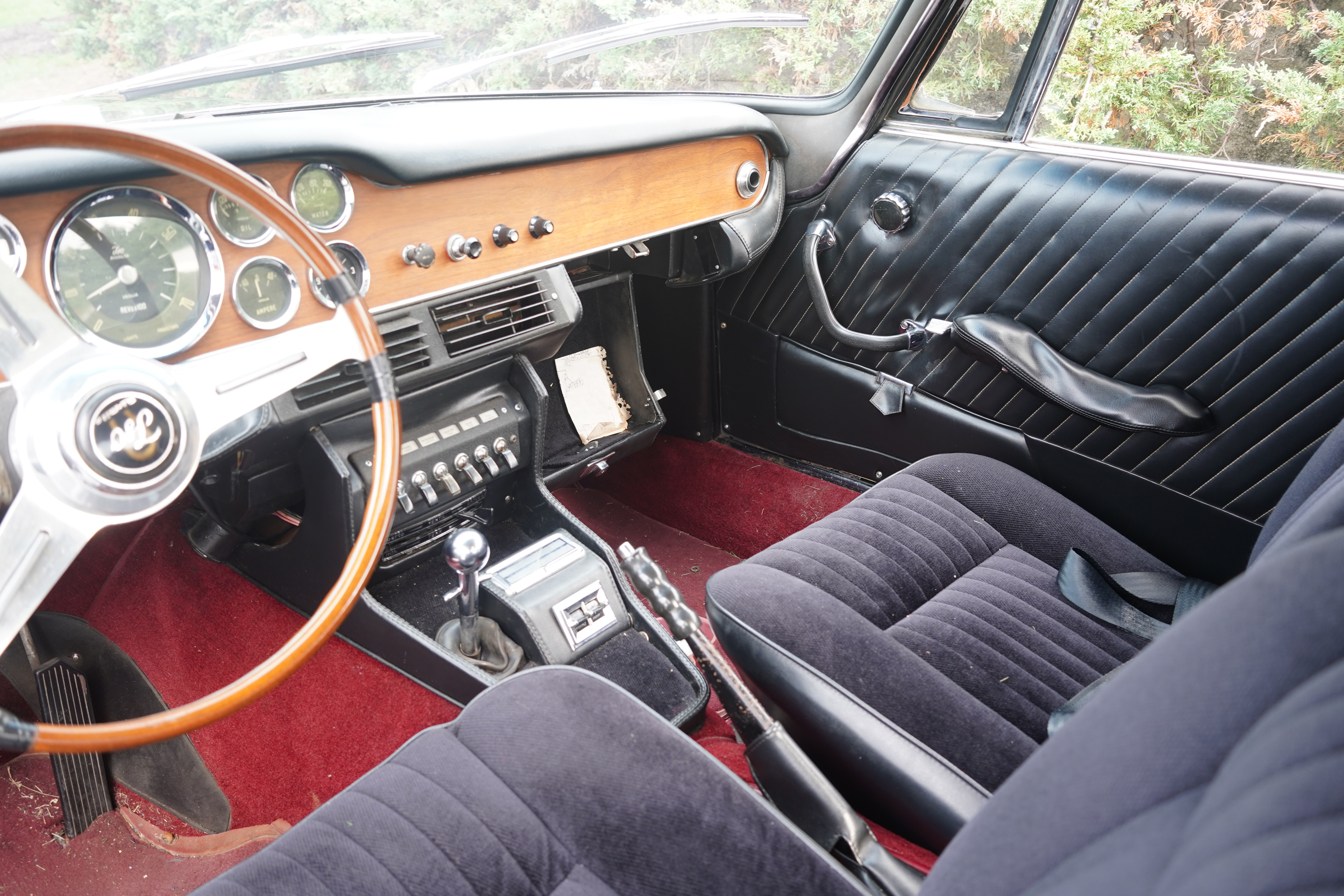 The exterior had not had a bath in months and the interior had not seen a vacuum in years. The front seat upholstery was obviously incorrect. The steering wheel was held together with electrical tape. Popping open the glove box, the door fell beyond its catch, dumping its contents of plastic cups, trash, and some aluminum foil (drugs??) onto the floor. I left it there, as the paraphernalia hid some of the dirt on the carpet.