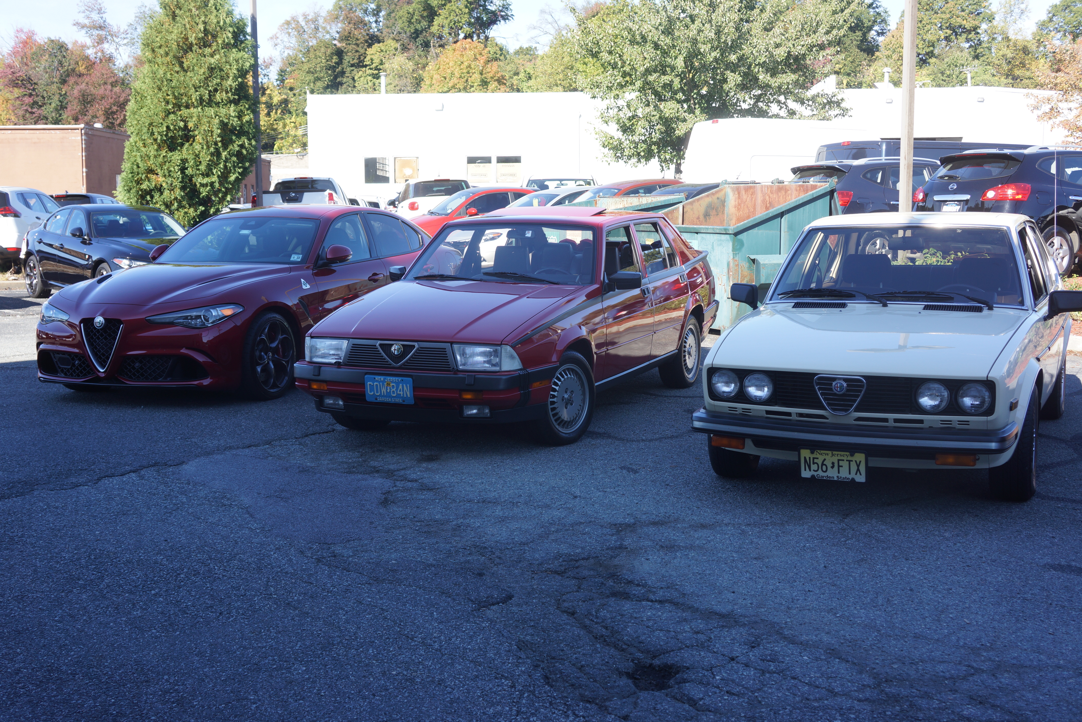Three generations of Alfa sedans: Giulia, Milano, & Alfetta (L to R)