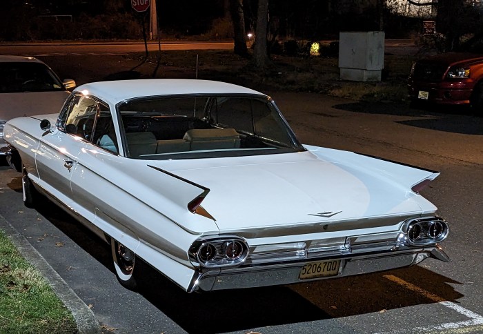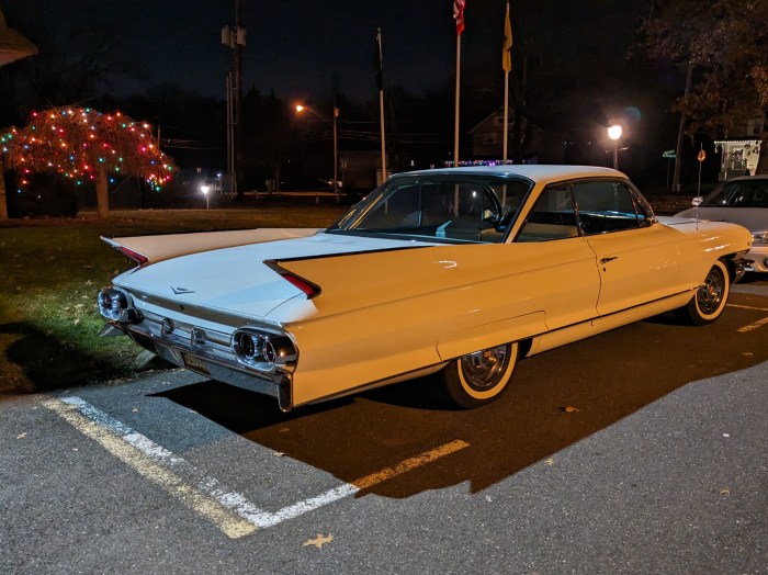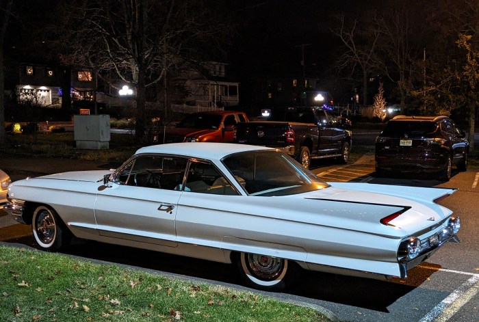 Last Thursday, the monthly AACA meeting ended around 9 p.m., its usual time. I was tired, and anxious to begin the one-hour drive home. After wishing Happy Holidays to those around me, I grabbed my coat and headed out the door of the American Legion Hall. And there it was. Suddenly tired no more, I froze, perhaps because its appearance was so unexpected, or perhaps because its enormity stood out in a parking lot full of smaller, modern vehicles. In this setting, there was nothing similar to distract from its visual impact. This 1961 Cadillac Coupe DeVille was a grand automobile when new, and is still grand today, in every sense of the word.