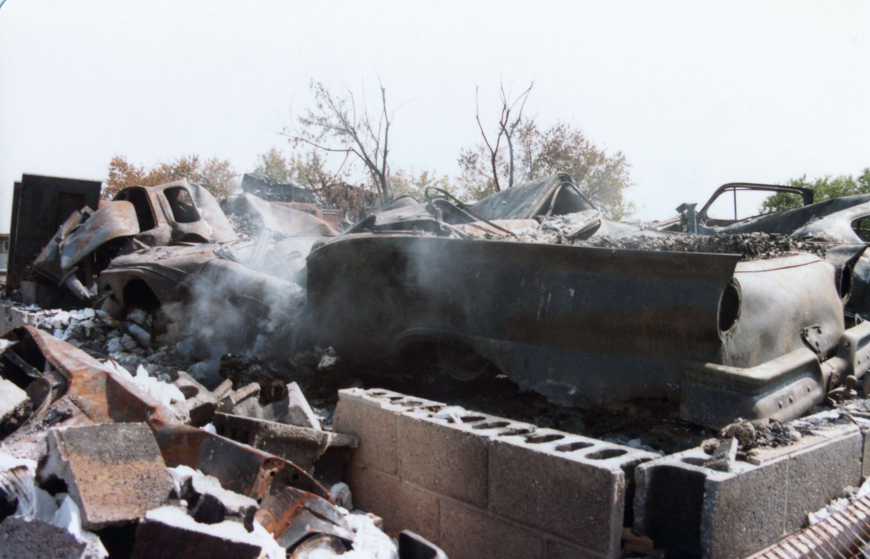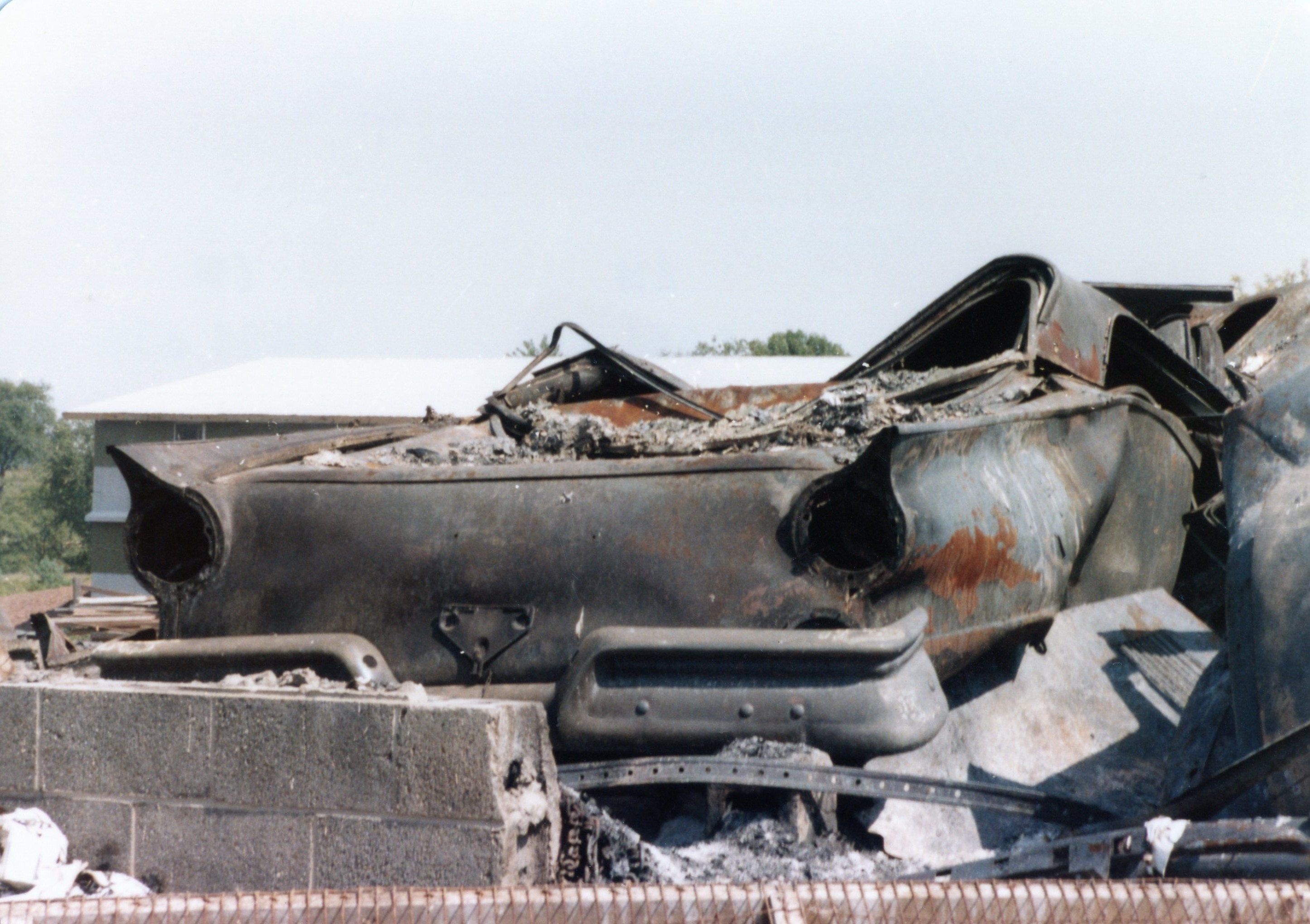 I waited until the weekend to drive out to the site. Four days after the phone call, the pile of ashes was still smoldering. The building was gone, and so were all 50 cars. Amazingly, I could spot my Ford. The fact that it was on the 2nd floor meant that as the building collapsed, my car was on top. But I was horrified at what fire can do: the glass, engine, wiring, and much of the sheet metal were consumed. The only component potentially salvageable was the rear bumper. It was all I could do to snap a few photographs and walk away.