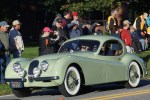 1959 Volvo 544, white, grey interior, dual fender-mount mirrors, chrome aftermarket wheels.