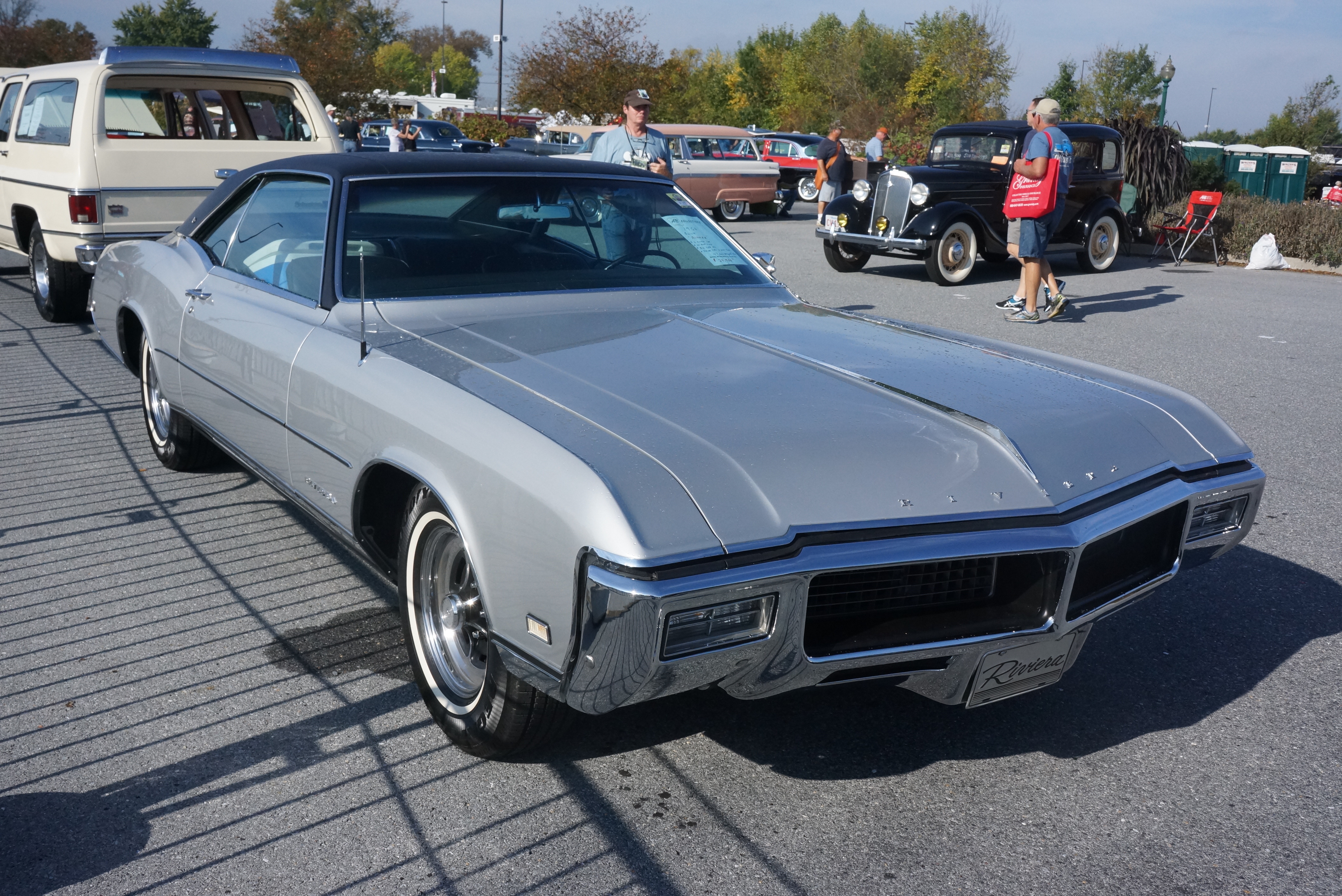 1963 Buick Riviera, gold, beige cloth interior, factory A/C, sign claims front disc brakes which must be aftermarket (’63 Rivs had finned drums all around).