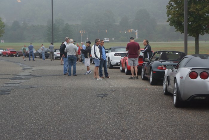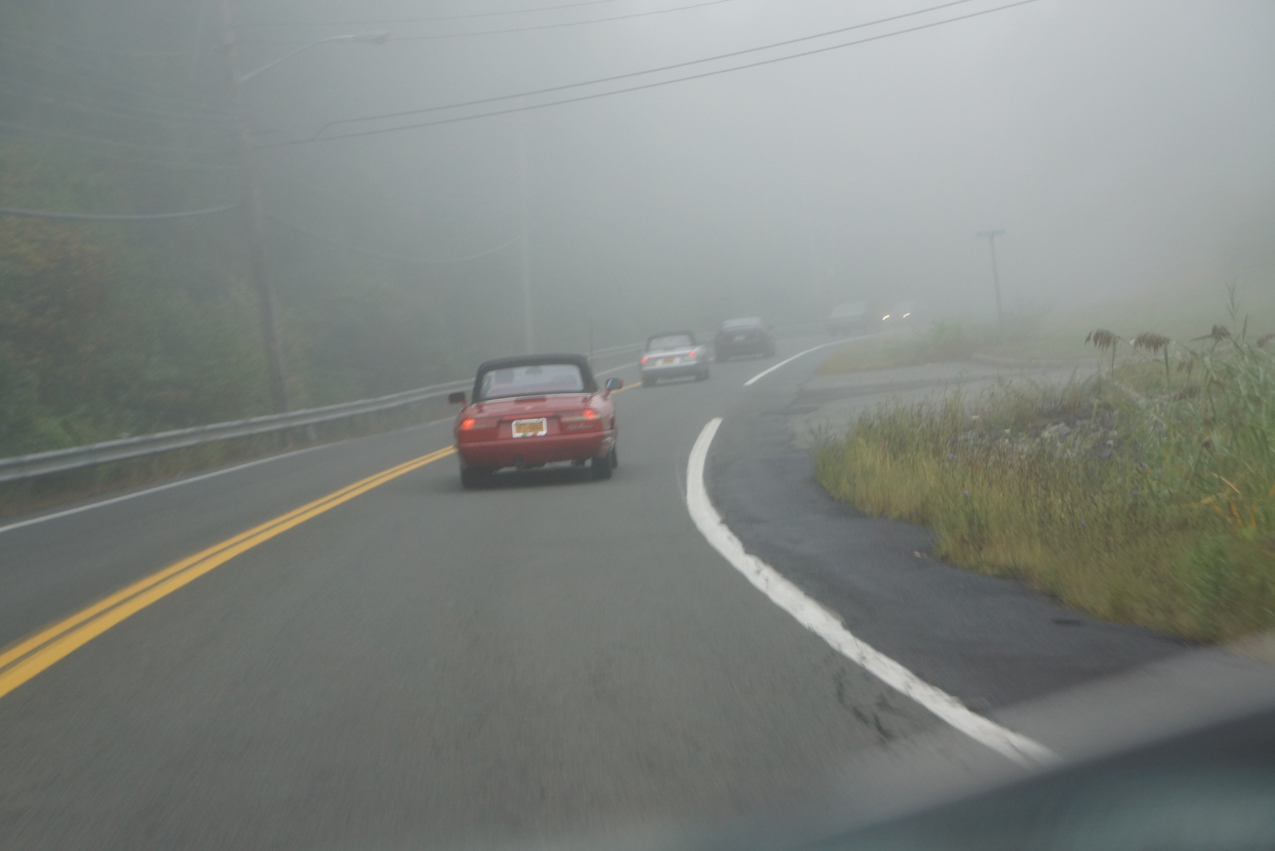 On Saturday, the forecast for Sunday, September 17, 2017 predicted a sunny, warm, humid day, with a slight chance of thundershowers. Except we all woke up to fog and mist. As I headed to the garage and looked at the Alfa, then the Miata, I considered taking the newer car. I quickly changed my mind; it’s not as though I’ve never driven the Alfa in the rain. My determination was to set an example, and as I pulled onto the highway, wipers flailing, headlights barely cutting through the fog, I told myself that we’d be lucky if 7 or 8 cars showed up for this morning’s breakfast run.