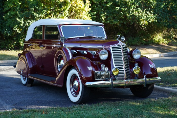 - 1936 DeSoto 4-door convertible: I had a long chat with the owner’s wife, who told me that this had been her father-in-law’s car, so it’s been in the family for a long time. She said the car is very comfortable and has been extremely reliable. She and her husband also have done The Great Race twice, for which they purchased a 1971 GTO! But it sounded like they both enjoyed that experience less, as she described the tremendous pressure to compete, as it’s a TSD rally. It’s interesting to compare the styling of this ’36 to the 1935 DeSoto Airflow which was also on the tour.