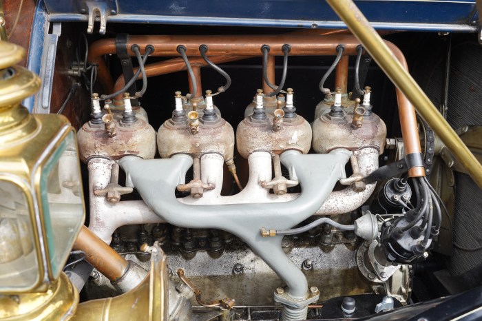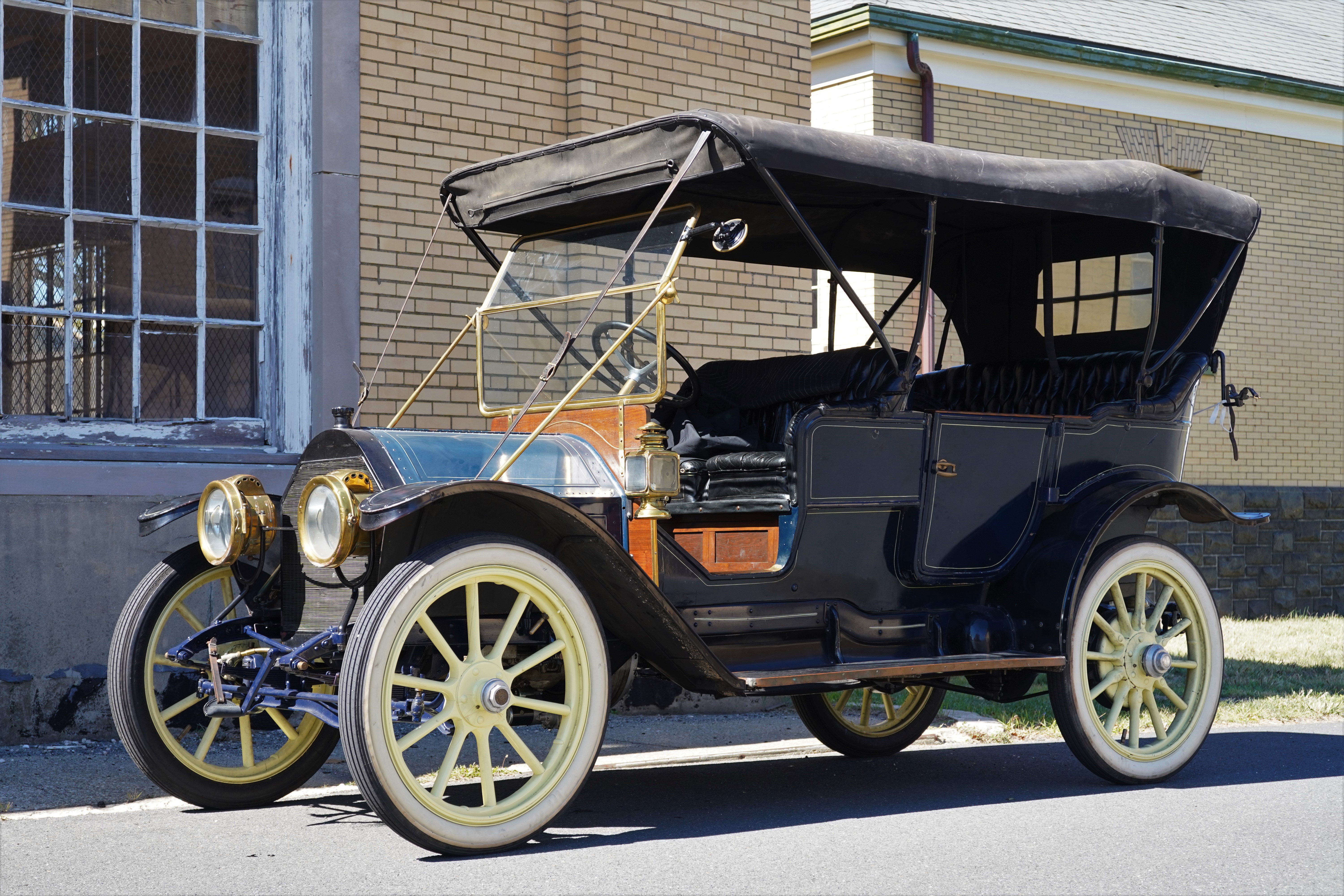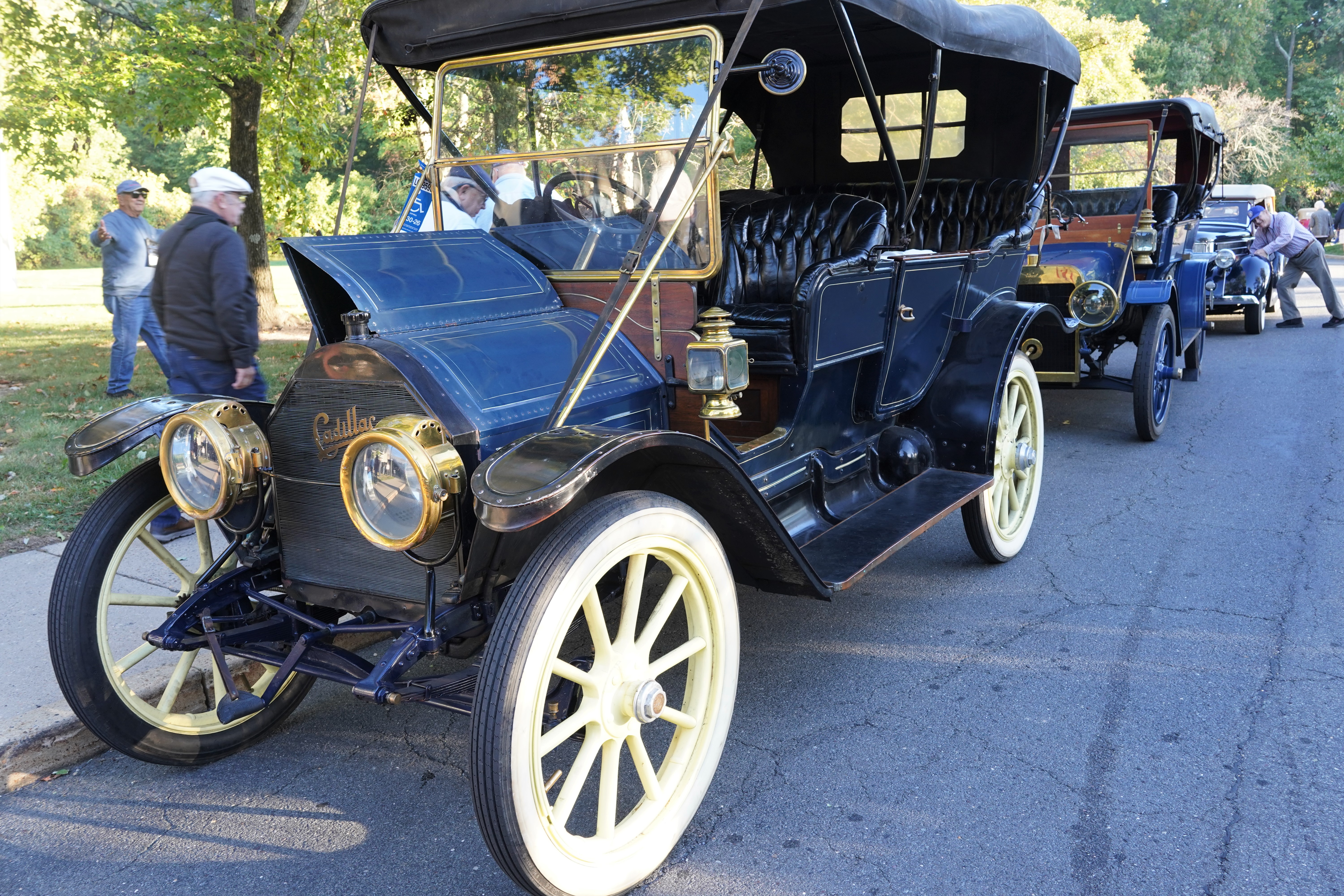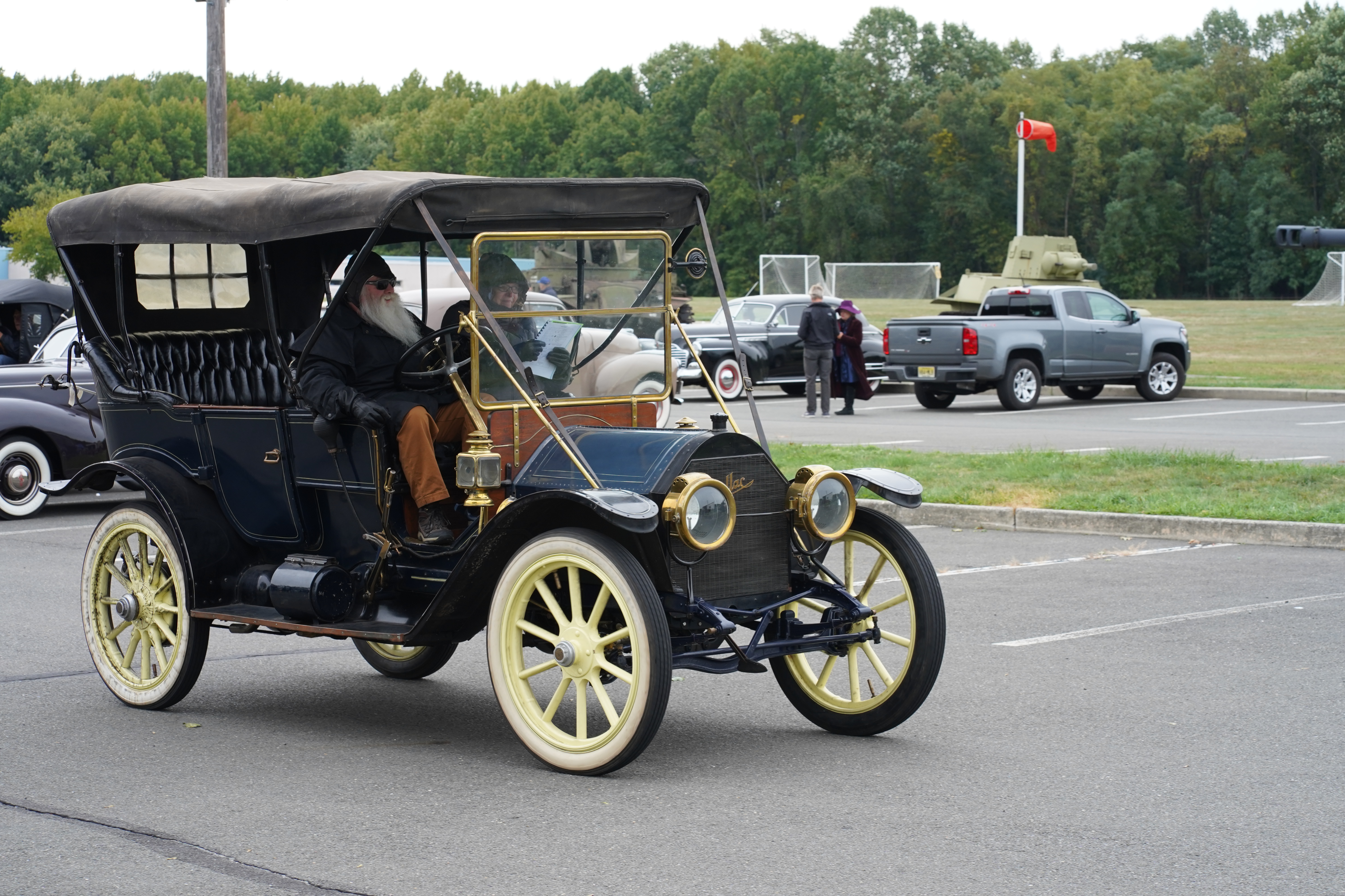 - 1911 Cadillac Model 30 Touring: All credit goes to the driver and passenger of this 4-door open car, both of whom brought adequate clothing for the conditions, which thankfully remained mostly warm and dry. This was one of the oldest cars on the tour, yet they were out there, often leading the pack! When the driver finally opened the hood for me to peek, I saw that the car was running a 4-cylinder engine with twin spark plugs per cylinder. As per Wikipedia, this engine displaced 3.7L, quite large for a 4-banger. Wiki also states that the 1911 Cadillac was the first car to have an electric starter.