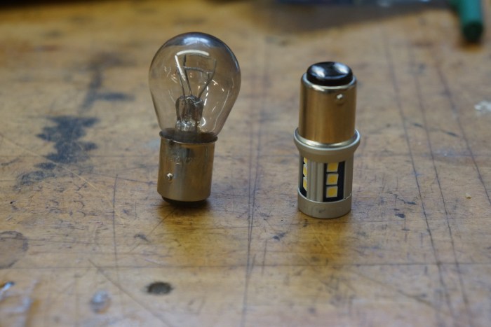 Next to be installed were the reverse lights. This was a great improvement, as the light is not only markedly brighter, the color is a pure white, compared to the hazy yellow of the incandescents.