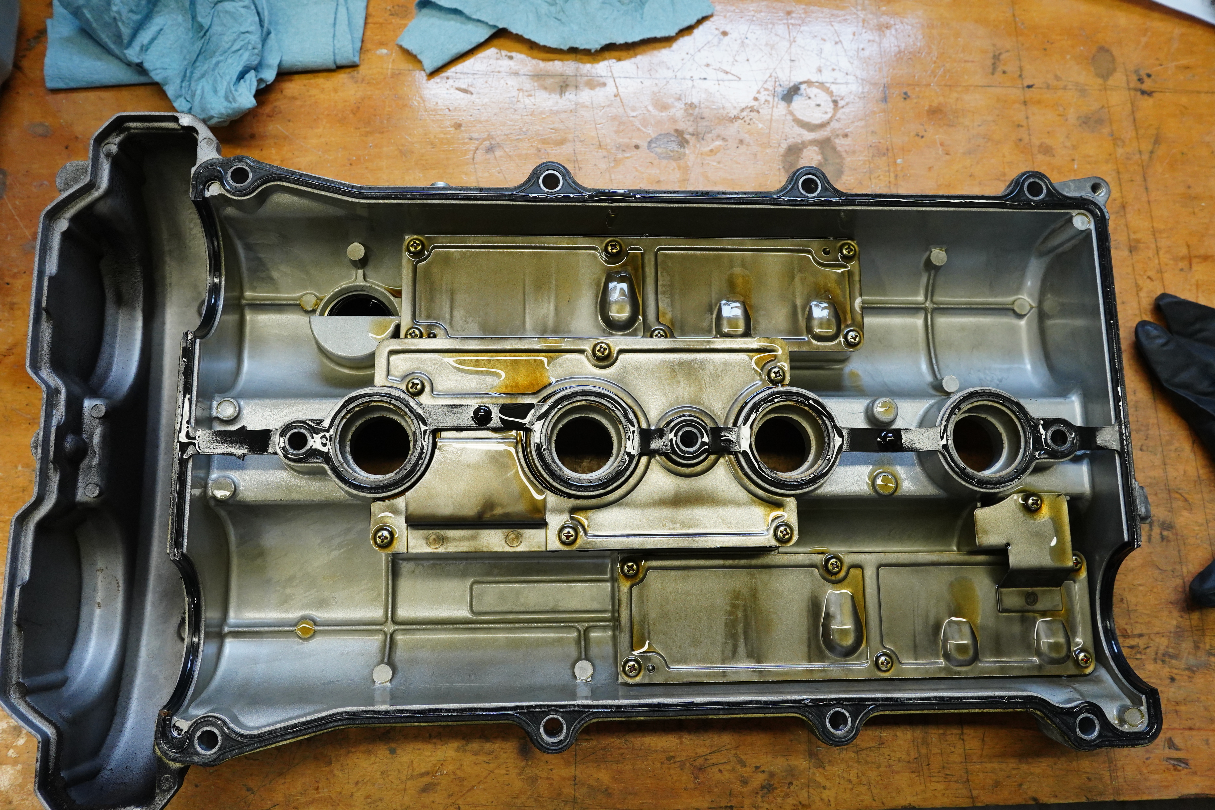 Underside of valve cover, old gasket still in place.Miata engine, 30 years old, 109,000 miles, looks clean to me