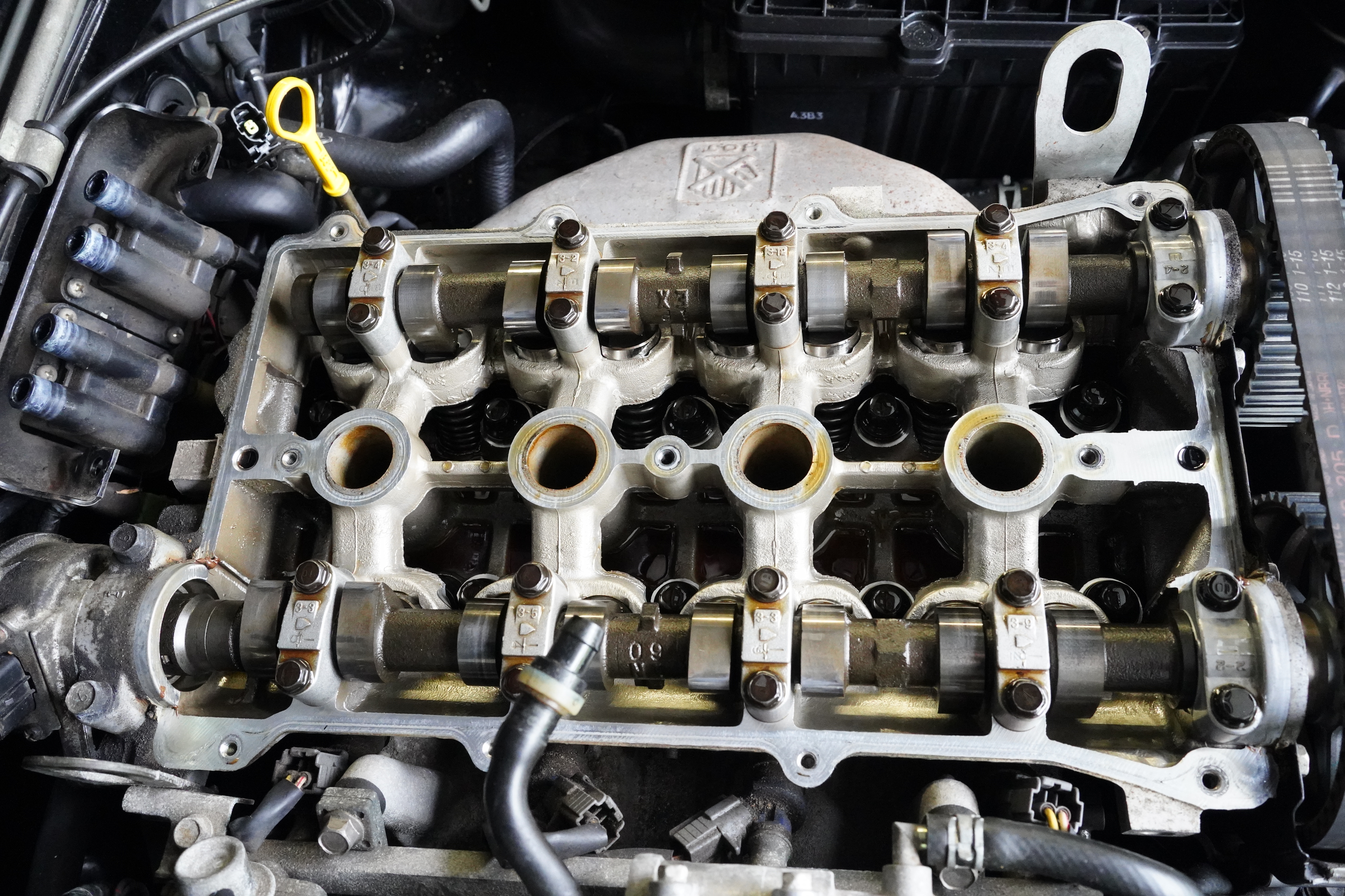 Again, I was glad to have the valve cover out of the way, as engaging the dogs into the cam was a cinch. I rotated the CAS to where I had marked it, locked it down, put the new valve cover gasket in place, and reinstalled everything which had been removed. The car started on first try, and while it was too wet today to go for a test drive, I plan to clean off the underside as best possible, then drive the car to confirm the leak is fixed.