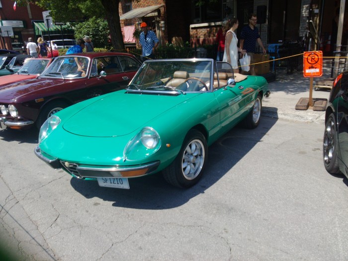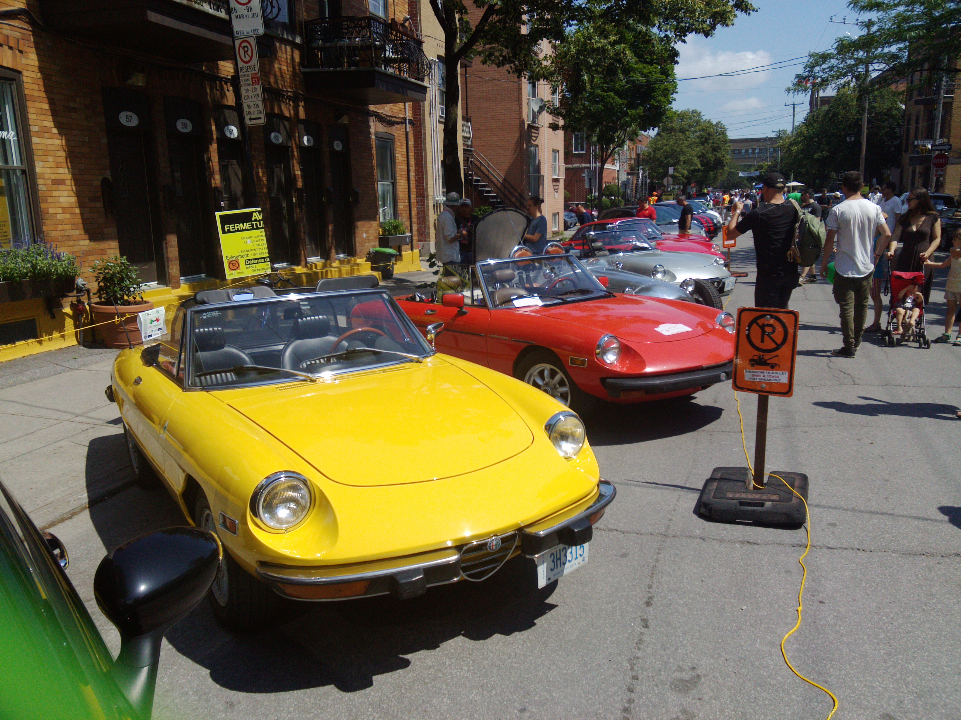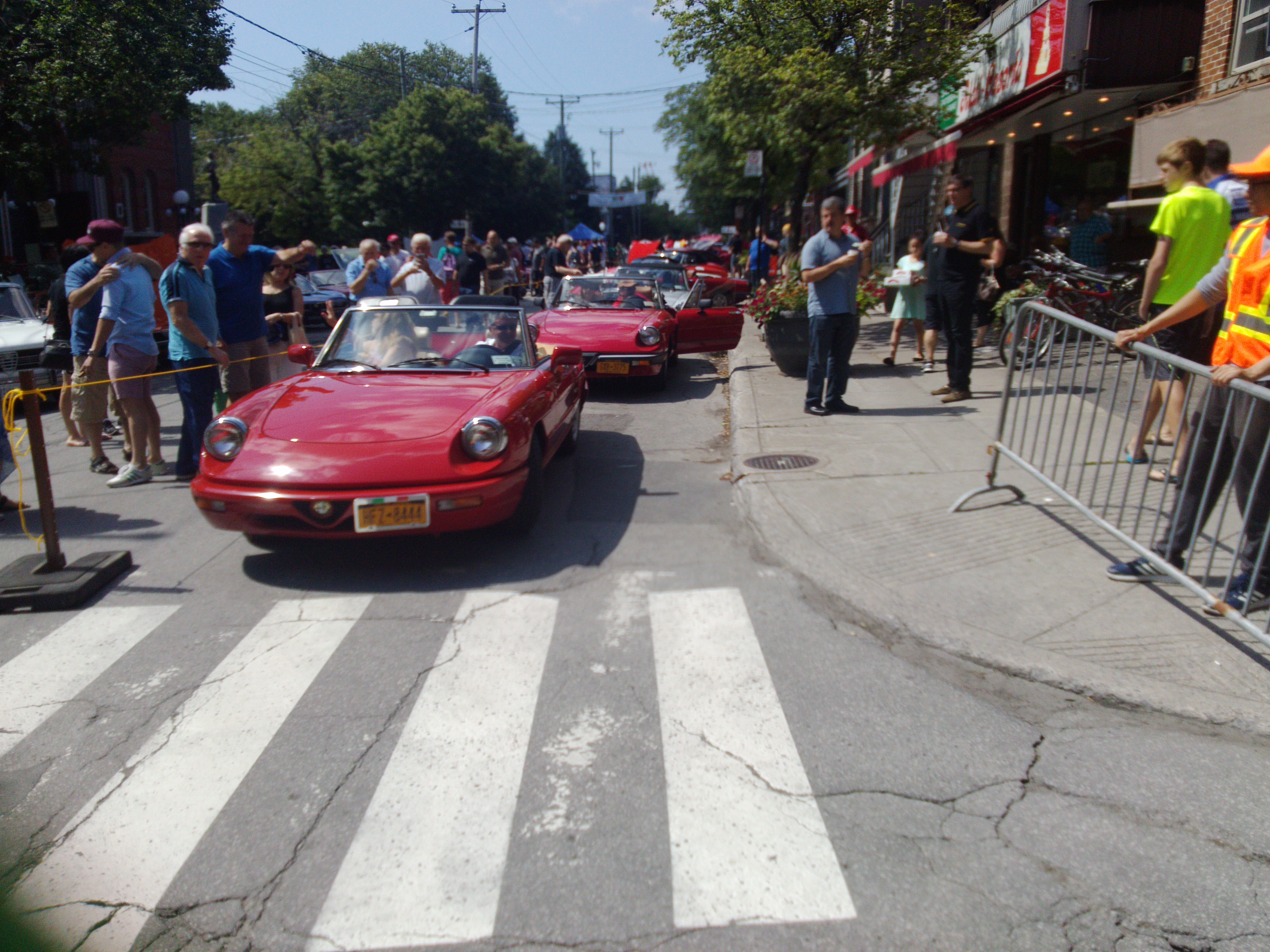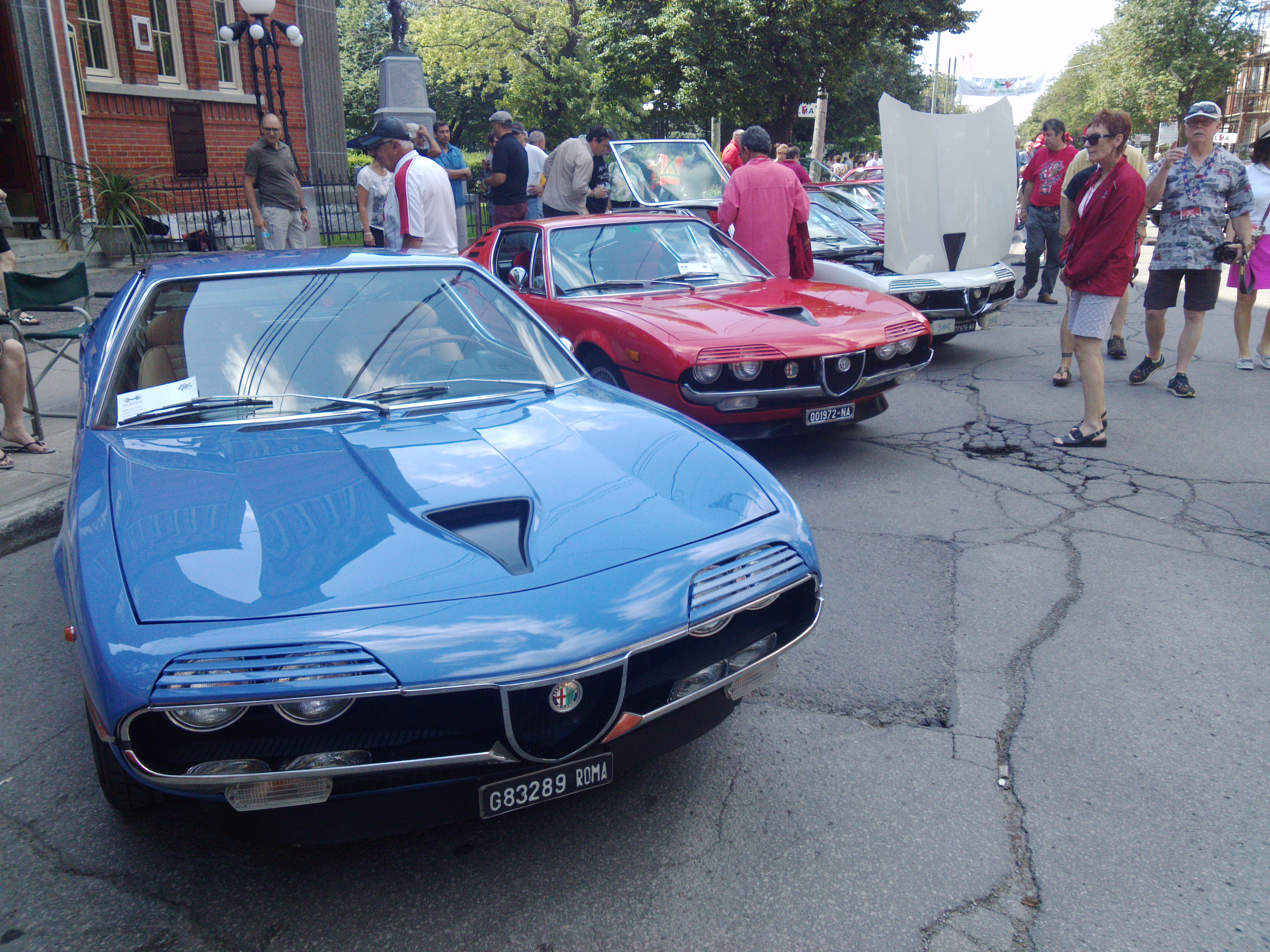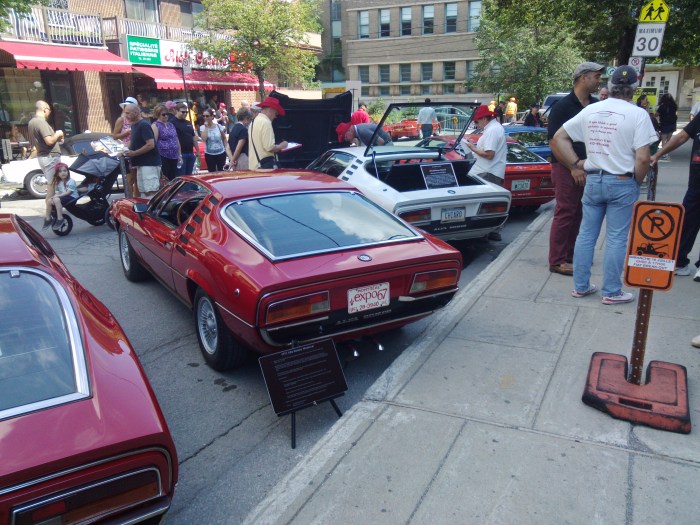 The show was held in conjunction with the Fiat Club of Montreal, and was billed as “Montreal’s Official Italian Automobile Festival”. In addition to the dozens of Alfas, there were Fiats, Lamborghinis, Ferraris, and DeTomasos. All the cars were parked on Rue Dante, a main drag through Little Italy, and the locals came out in force to take in the sights and sounds. The neighborhood featured Italian restaurants, bakeries, and shops, so breakfast and lunch were closer to what you’d find in Rome rather than Paris. Given star billing at the head of the street were eight Alfa Romeo Montreals parked in a row, a sight that I never thought I’d see.