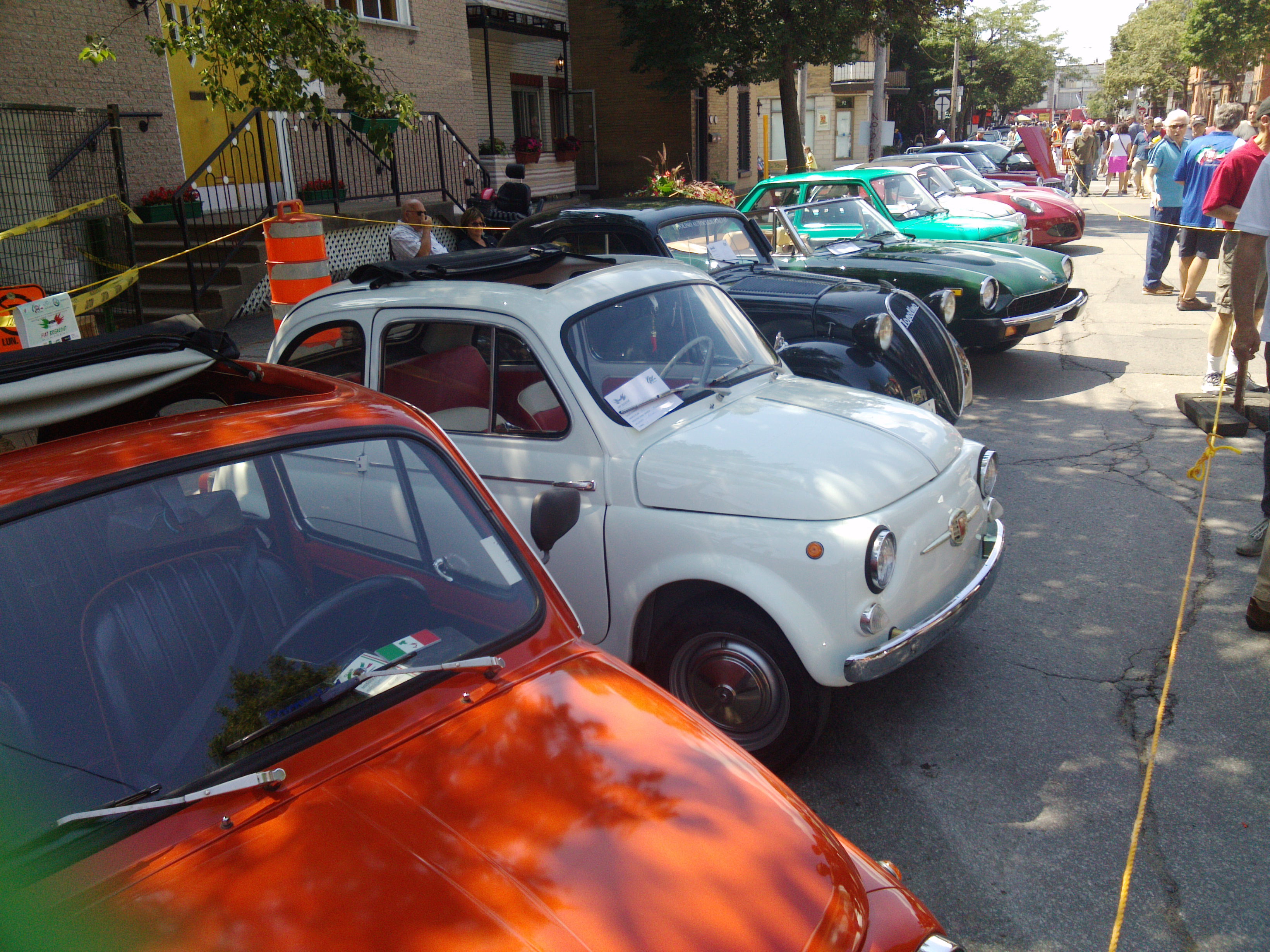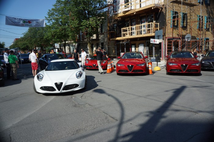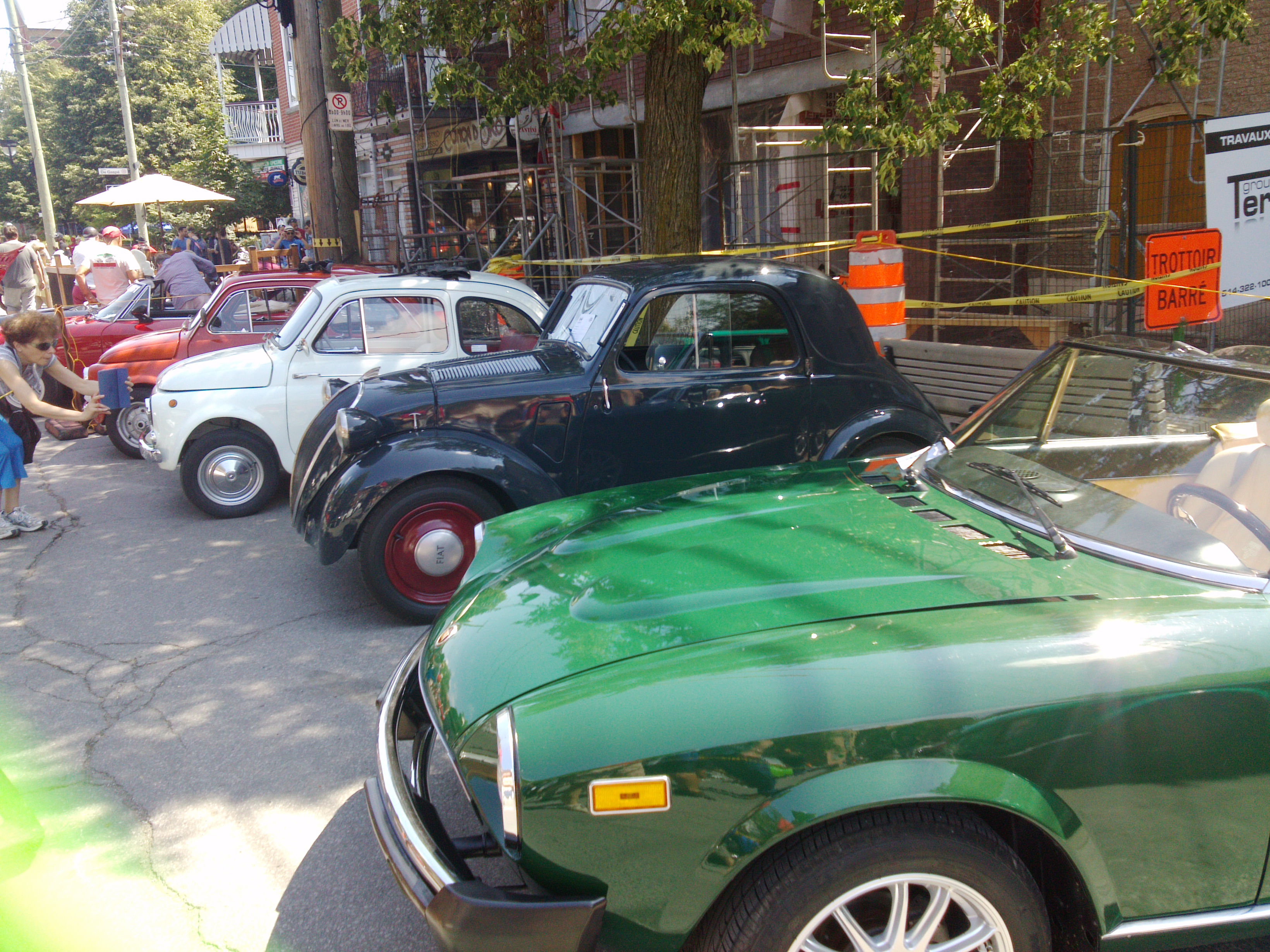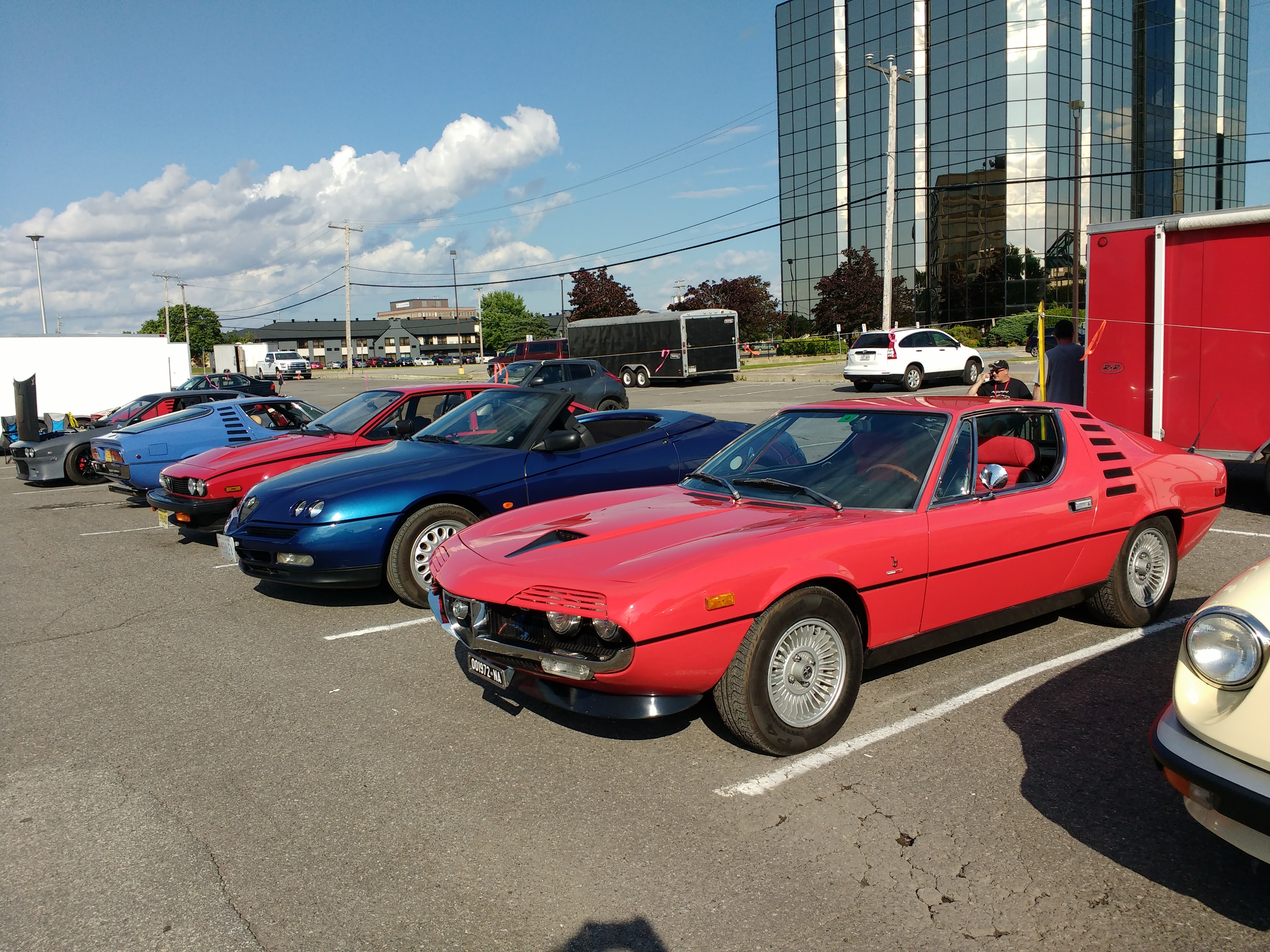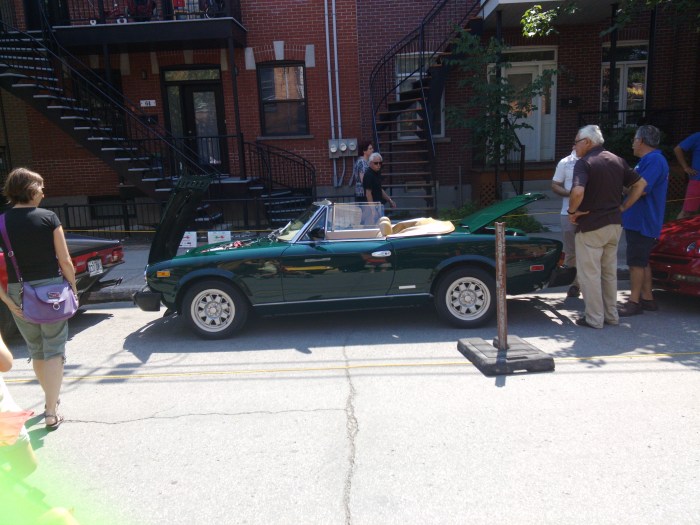 The show was held in conjunction with the Fiat Club of Montreal, and was billed as “Montreal’s Official Italian Automobile Festival”. In addition to the dozens of Alfas, there were Fiats, Lamborghinis, Ferraris, and DeTomasos. All the cars were parked on Rue Dante, a main drag through Little Italy, and the locals came out in force to take in the sights and sounds. The neighborhood featured Italian restaurants, bakeries, and shops, so breakfast and lunch were closer to what you’d find in Rome rather than Paris. Given star billing at the head of the street were eight Alfa Romeo Montreals parked in a row, a sight that I never thought I’d see.