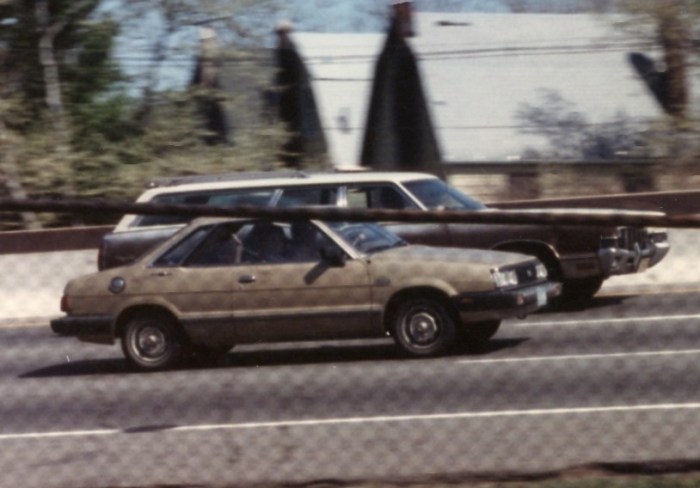 My college friend Beth came to visit me in Bloomfield. I think she bought this Subaru new. (I find it ironic that it’s a 2-door like the Subie above; this was back when Americans actually bought 2-door cars.) It’s probably FWD, as AWD was not yet standard across the board. Note the VW Squareback; when did you last see one in the wild?