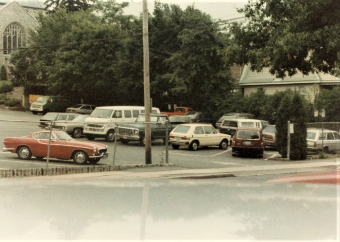 Street parking near the dealership was non-existent. Management made a deal with the church across the street which allowed employees to park there (the lot, frankly, was practically vacant except on Sundays). Yes, an employee (a son of one of the dealer principals) commuted in a Volvo 1800. At the top of the row, next to the Chevy Caprice, is a VW Dasher diesel wagon driven by the Parts Manager. The silver wagon on the far right is my Audi Fox wagon.